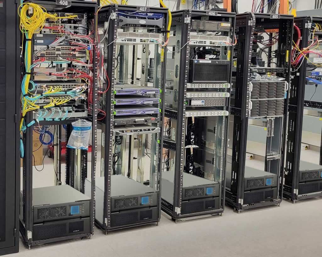 Data center racks housing critical IT infrastructure that rely on dependable three-phase UPS protection