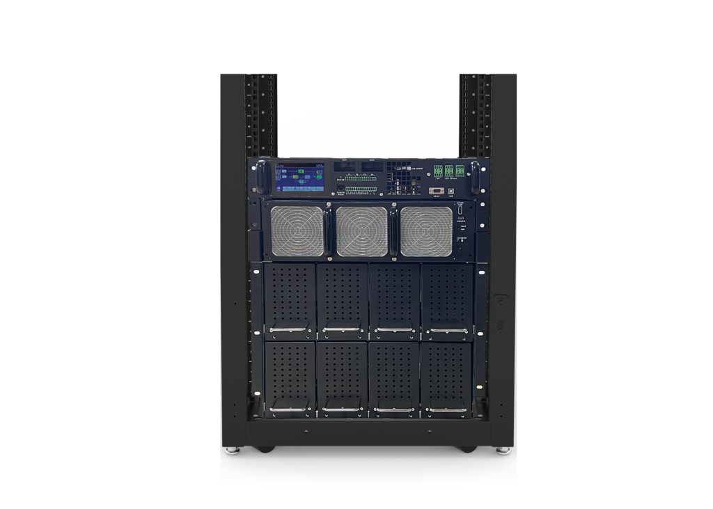 The system is delivered in multiple rack-mount sections and assembled within the rack using internal busbar connections.