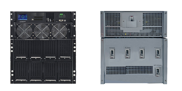 Front and rear views of the Ai90 modular UPS system showing serviceable design and connectivity for scalable deployments.