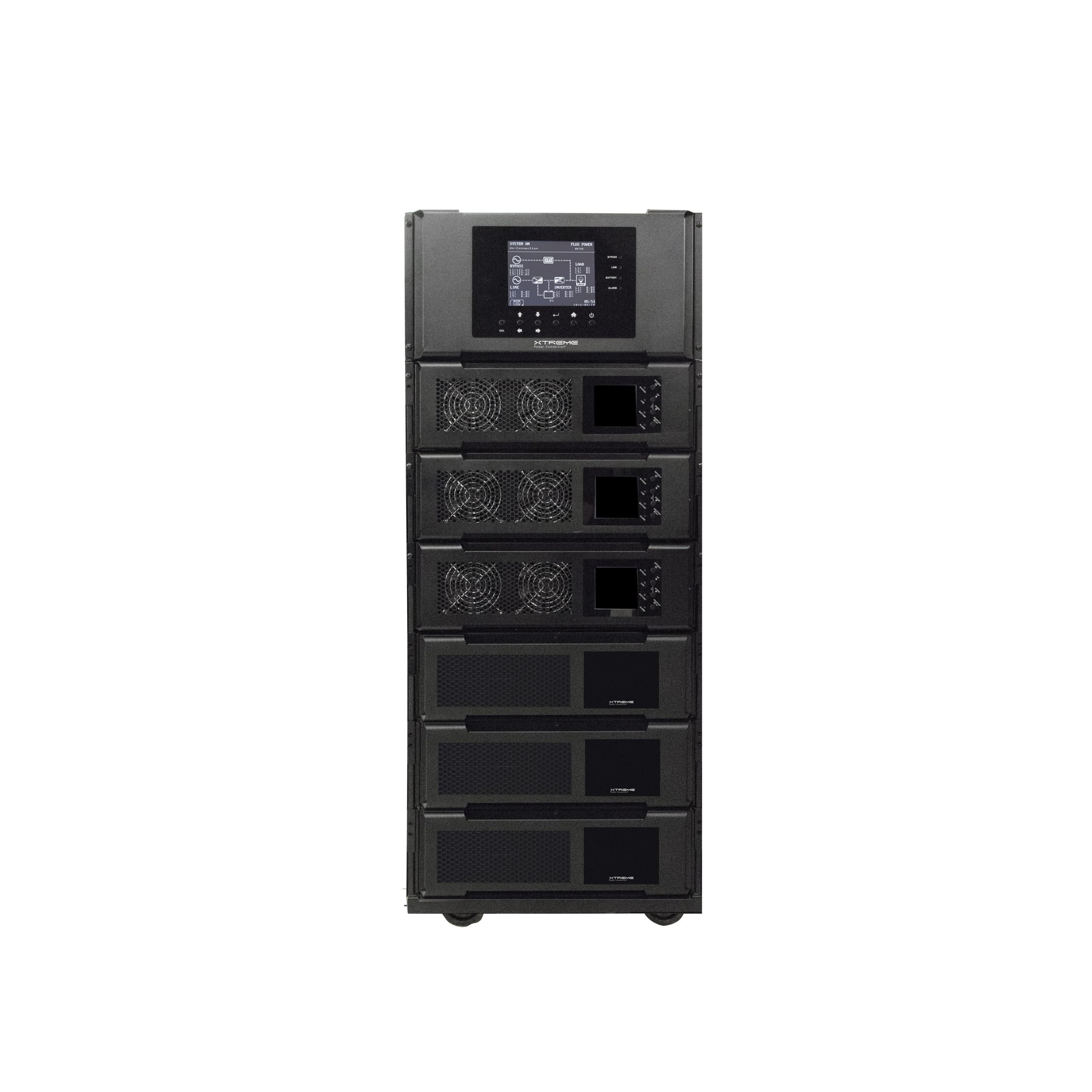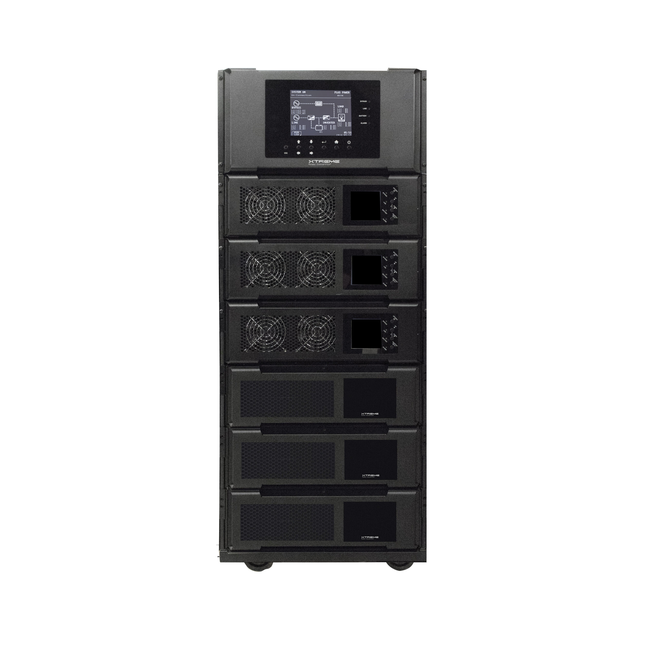 The Xtreme Power M90C-6S is a fully TAA compliant modular UPS, engineered for mission-critical federal, defense, enterprise, and industrial applications that demand secure, scalable three-phase power in a compact form factor. Its six-slot chassis allows a mix of power modules and hot-swappable battery modules—supporting up to three power modules while using remaining slots for battery runtime expansion (for example, 3P+3B, 2P+4B, or 1P+5B). This modular flexibility enables capacity scaling, enhanced runtime, or N+1 redundancy without replacing the frame.