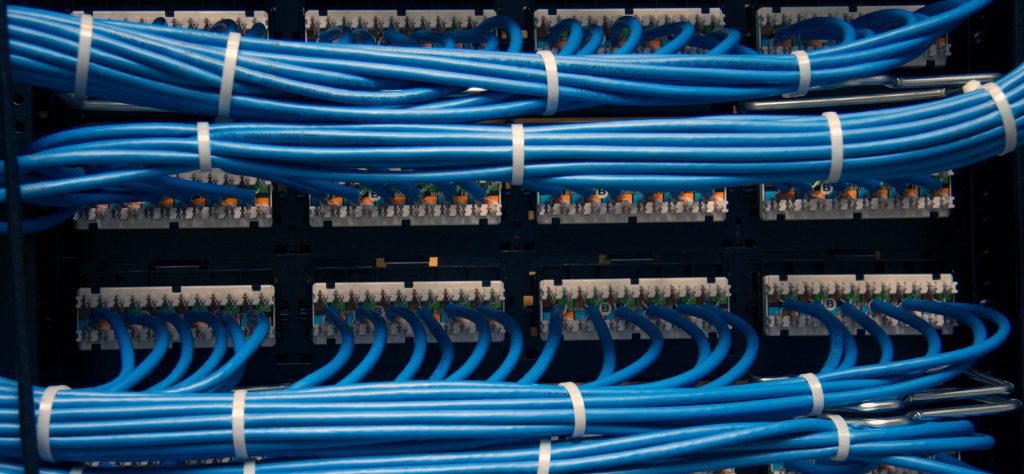 Structured data center cabling illustrating organized and compliant infrastructure where TAA-compliant UPS and Smart PDU solutions support critical power and network environments